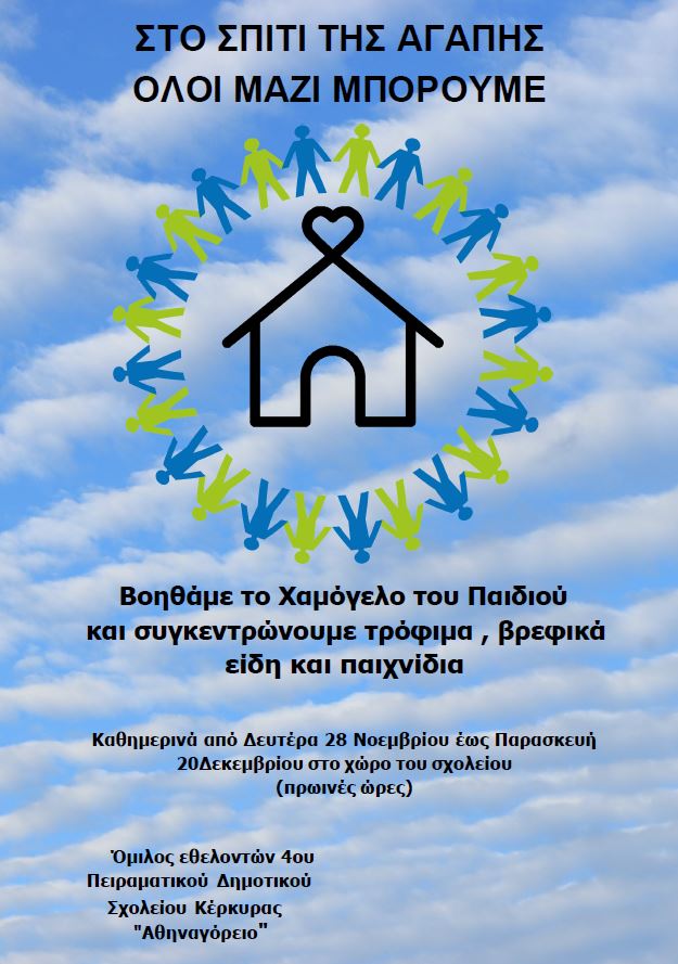Με πρωτοβουλία του Ομίλου Καινοτομίας και Δημιουργικότητας «Εθελοντισμός: …γιατί με ένα θέλω όλα τα μπορώ» του 4ου Πειραματικού Δημοτικού Σχολείου Κέρκυρας – «Αθηναγόρειο» γεμίζει το σπιτάκι της Αγάπης με τρόφιμα, βρεφικά είδη και παιχνίδια.