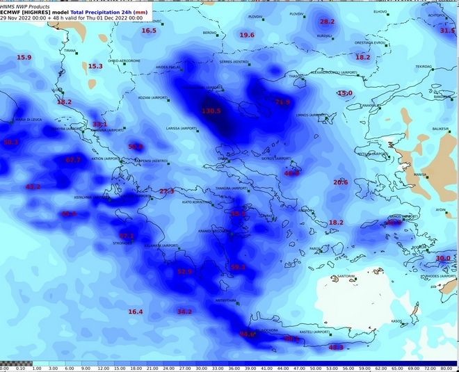 Σημειώνεται ότι τα φαινόμενα θα είναι κατά τόπους ιδιαίτερα ισχυρά στην κεντρική και την ανατολική Μακεδονία καθώς και στα βορειότερα τμήματα της Θεσσαλίας όπου υπάρχουν προγνωστικά για πάνω απο 100 mm βροχής.