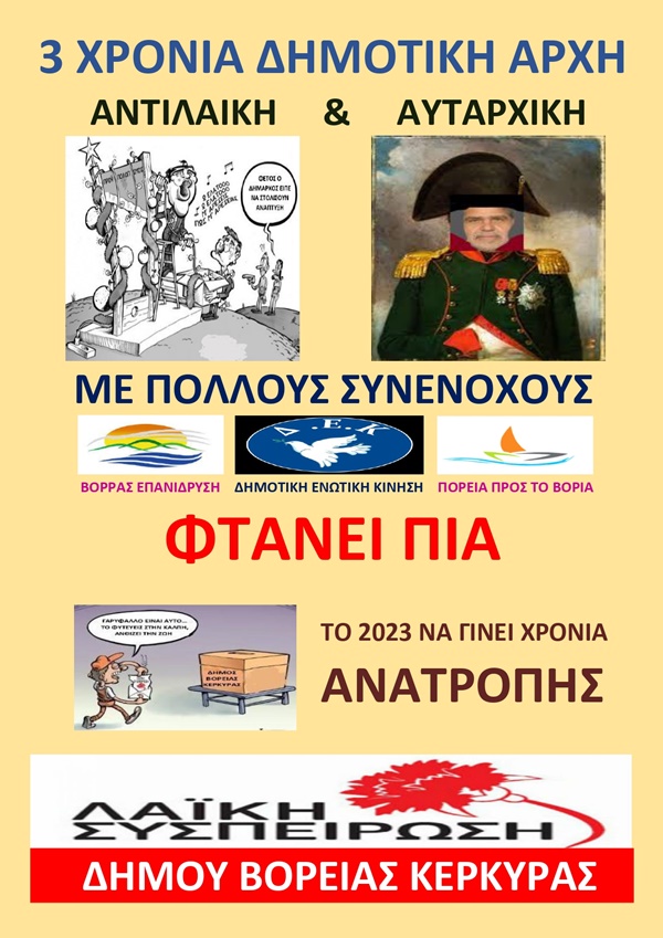 Τα αρχικά μεγάλα λόγια της δημοτικής αρχής τα διαδέχτηκαν 3 χρόνια αντιλαϊκών και αυταρχικών πράξεων. Μαζί της σε ρόλο συνένοχου κινήθηκαν και οι παρατάξεις ΔΕΚ, ΒΟΡΡΑΣ ΕΠΑΝΙΔΡΥΣΗ, ΠΟΡΕΙΑ ΠΡΟΣ ΤΟ ΒΟΡΙΑ ψηφίζοντας βασικές επιλογές της δημοτικής αρχής και συμβιβαζόμενες με τις πρακτικές της. Φτάνει πια αυτή η κατάσταση. Η περιοχή, οι κάτοικοι και η νεολαία μας αξίζουν μια καλύτερη προοπτική. Το 2023 μπορεί να γίνει χρονιά ΑΝΤΕΠΙΘΕΣΗΣ και ΑΝΑΤΡΟΠΗΣ της ασχήμιας που βαρύνει την ζωή μας. Η ΛΑΙΚΗ ΣΥΣΠΕΙΡΩΣΗ καλεί όλους τους συνδημότες σε κοινό αγώνα για να βάλουμε μπροστά τις ανάγκες μας και να νικήσουμε.