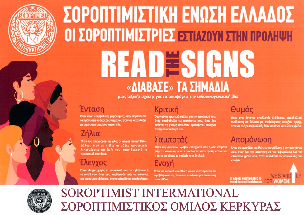 Ο Σοροπτιμιστικός Όμιλος Κέρκυρας, μέλος της Ευρωπαϊκής Σοροπτιμιστικής Ομοσπονδίας, ακολουθεί φέτος τη θεματική της για το 16ήμερο «Διάβασε τα σημάδια» δηλ. την πρόληψη, που στοχεύει στην έγκαιρη διάγνωση, των όσων ίσως ακολουθήσουν, και την αποφυγή τους. Την αποφυγή της ενδοοικογενειακής, και όχι μόνον, βίας. Βίας που δεν είναι μόνο προσωπική υπόθεση, αλλά δεν είναι και αναπόφευκτη, αλλά ένα παγκόσμιο, κοινωνικό πρόβλημα, μια παγκόσμια κρίση που ανθίζει όταν συνυπάρχουν άλλες κρίσεις: πολεμικές συγκρούσεις, φυσικές καταστροφές, ανασφάλεια επισιτιστική, πανδημίες. (σύμφωνα με τα στοιχεία των γυναικών των Ηνωμένων Εθνών η βία κατά των γυναικών επιδεινώθηκε λόγω της πανδημίας Covid-19). Είναι ένα ανθρώπινο θέμα που δεν αφορά μόνο τη γυναίκα, αφορά την κοινωνία, φυσικά και τους άνδρες που είναι υπεύθυνοι για τις κακοποιήσεις, παρενοχλήσεις, βιασμούς, όχι μόνο γυναικών αλλά και παιδιών, (στοιχεία που δόθηκαν από την ΕΛ.ΑΣ απ’ τις αρχές του 2022 μέχρι τέλους Αυγούστου 2022 δείχνουν ότι κακοποιήθηκαν σεξουαλικά 294 παιδιά, απ’ τα οποία 244 κορίτσια και 50 αγόρια) γυναικοκτονίες. (3.12.22 τελευταίο περιστατικό: Θάνατος 19χρονης από πυροβολισμό συντρόφου της 24χρονου).