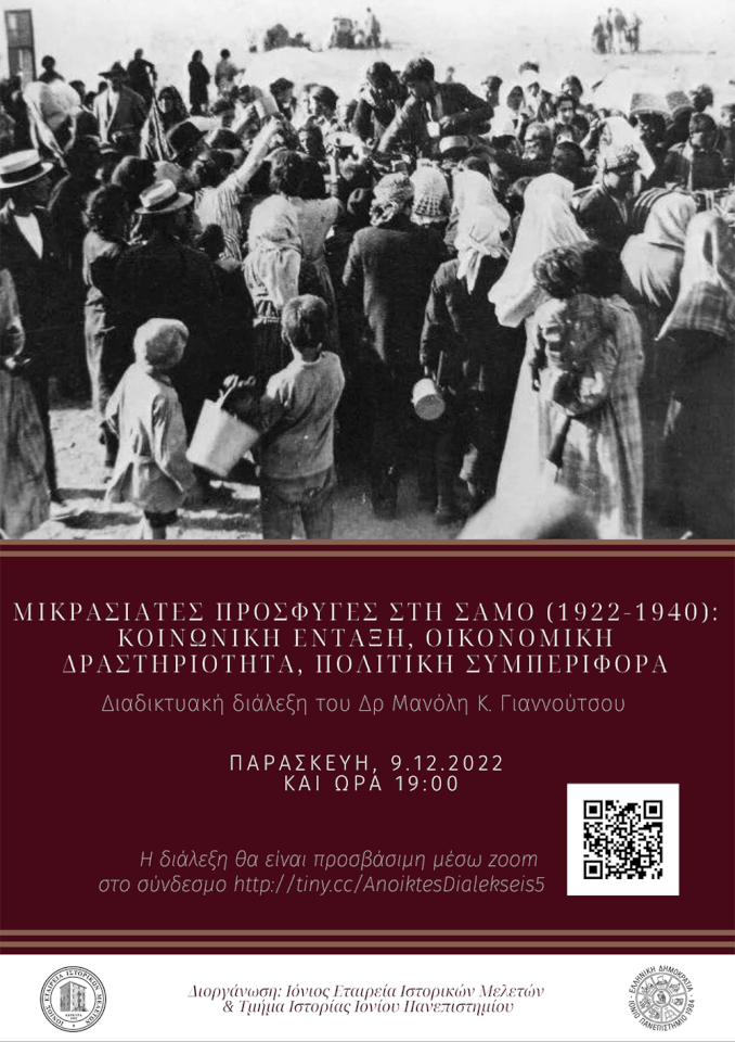 Η Ιόνιος Εταιρεία Ιστορικών Μελετών και το Τμήμα Ιστορίας του Ιονίου Πανεπιστημίου διοργανώνουν διαδικτυακή διάλεξη με τίτλο «Μικρασιάτες πρόσφυγες στη Σάμο (1922-1940): Κοινωνική ένταξη, οικονομική δραστηριότητα, πολιτική συμπεριφορά».