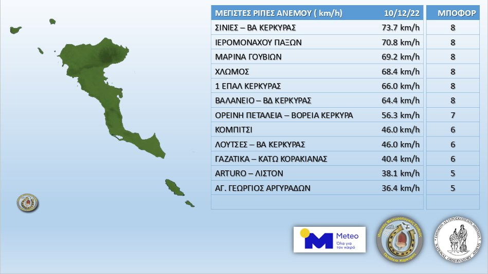 Οι μέγιστες ριπές που καταγράφηκαν ήταν σε Σινιές, Ιερομόναχο Παξών, Μαρίνα Γουβιών, Χλωμό, 1ο ΕΠΑΛ και Βαλανειό, καθώς έφτασαν τα οκτώ μποφόρ.