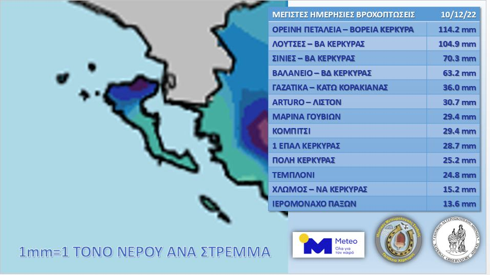 Η κακοκαιρία “Gaia” έφερε βροχόπτωση το Σάββατο στην περιοχή μας δείχνοντας στοιχεία έντονης τοπικότητας καθώς ο σταθμός στην Πετάλεια Κέρκυρας κατέγραψε συνολική βροχόπτωση 114 mm που αντιστοιχούν σε 114 τόνους νερού ανά στρέμμα την ίδια ώρα που στις ΛΟΥΤΣΕΣ είχαμε 104 mm.