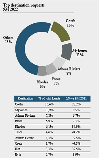 Ακολουθεί η Μύκονος με 11%, η λεγόμενη ως «αθηναϊκή Ριβιέρα», τα παράλια της νοτιοδυτικής Αττικής με 8%, η Πάρος με 7% και στην πέμπτη θέση η Ρόδος με 6%.