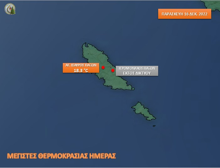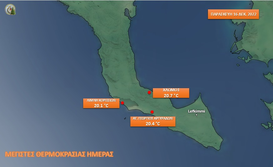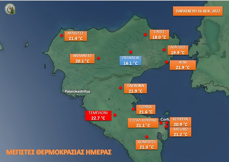Σύμφωνα με το μετεωρολογικό σταθμό του Ιόνιου Πανεπιστημίου, η απολύτως μέγιστη της ημέρας καταγράφηκε στο ΤΕΜΠΛΟΝΙ και ήταν ίση με 22,7 βαθμούς Κελσίου !