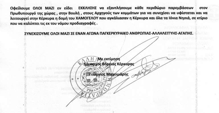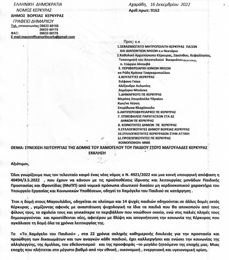 Επιστολή του Δημάρχου Βόρειας Κέρκυρας προς φορείς και προσωπικότητες της Κέρκυρας και αφορά στη δομή του Χαμόγελου στους Μαγουλάδες.