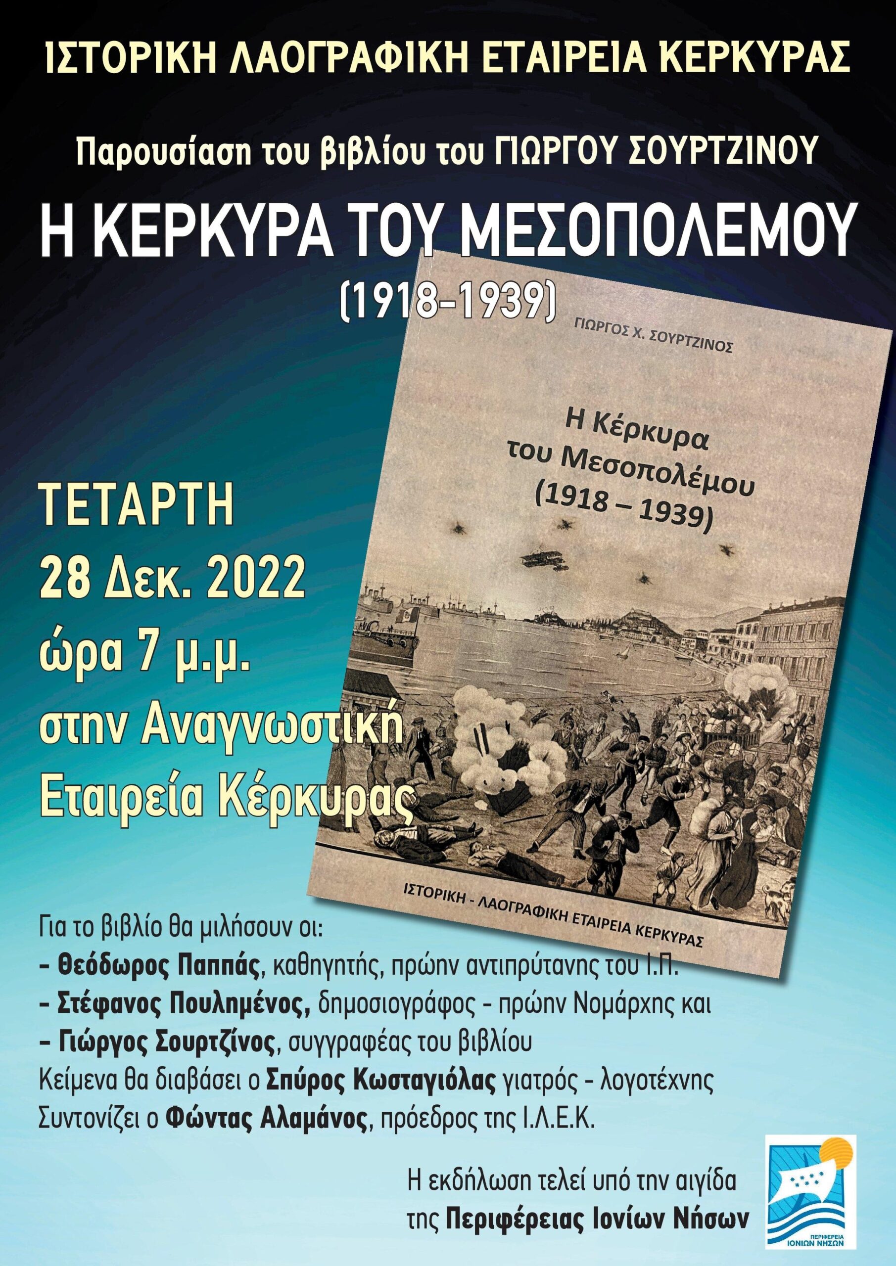Η Ιστορική Λαογραφική Εταιρεία Κέρκυρας διοργανώνει την Τετάρτη 28 Δεκεμβρίου, στις 7μ.μ, στην Αναγνωστική, την παρουσίαση του βιβλίου του Γιώργου Σουρτζίνου “Η Κέρκυρα του Μεσοπολέμου 1918-1939”
