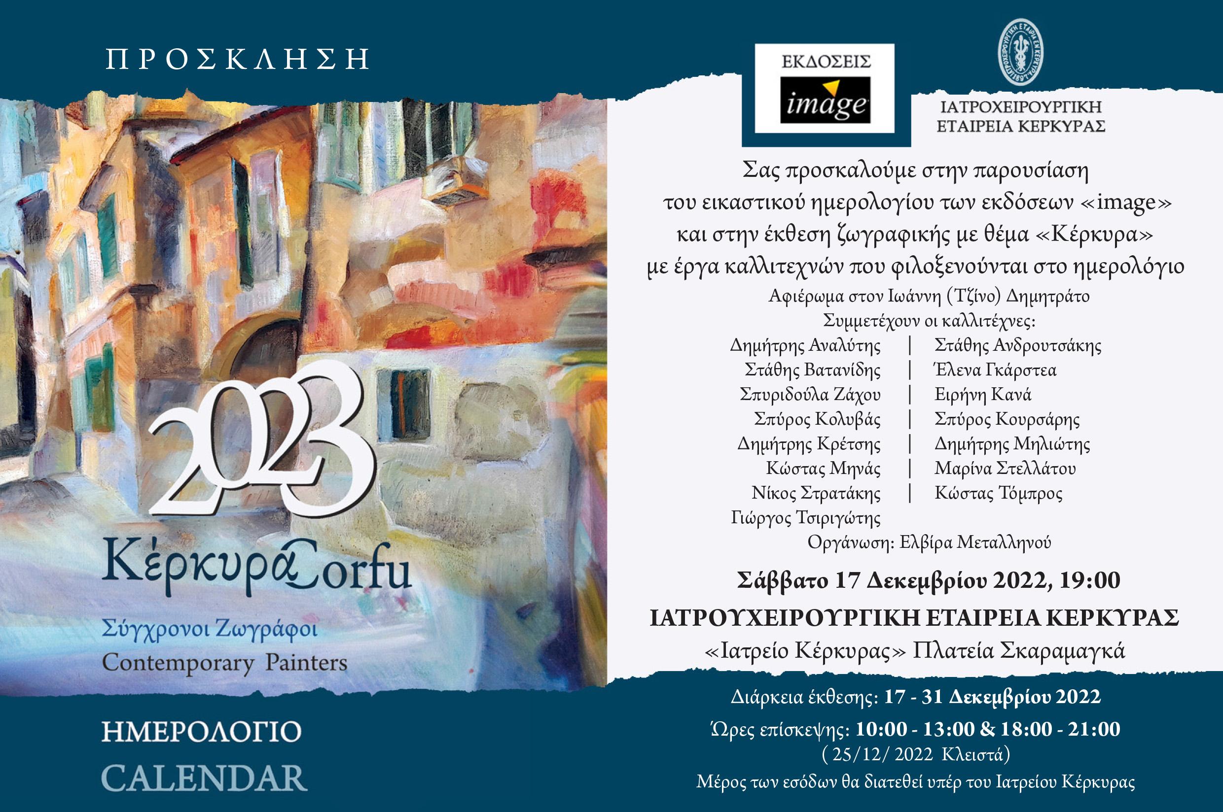 Οι εκδόσεις “image” παρουσιάζουν το εικαστικό ημερολόγιο 2023, το θέμα του οποίου είναι η Κέρκυρα. Παράλληλα οργανώνουν ομαδική έκθεση ζωγραφικής με τα έργα των καλλιτεχνών που φιλοξενούνται στο ημερολόγιο, στην αιθουσα της Ιατροχειρουργικής Εταιρείας Κέρκυρας (Ιατρείο) το Σάββατο 17 Δεκεμβρίου 2022 στις 07.00 μ.μ.
