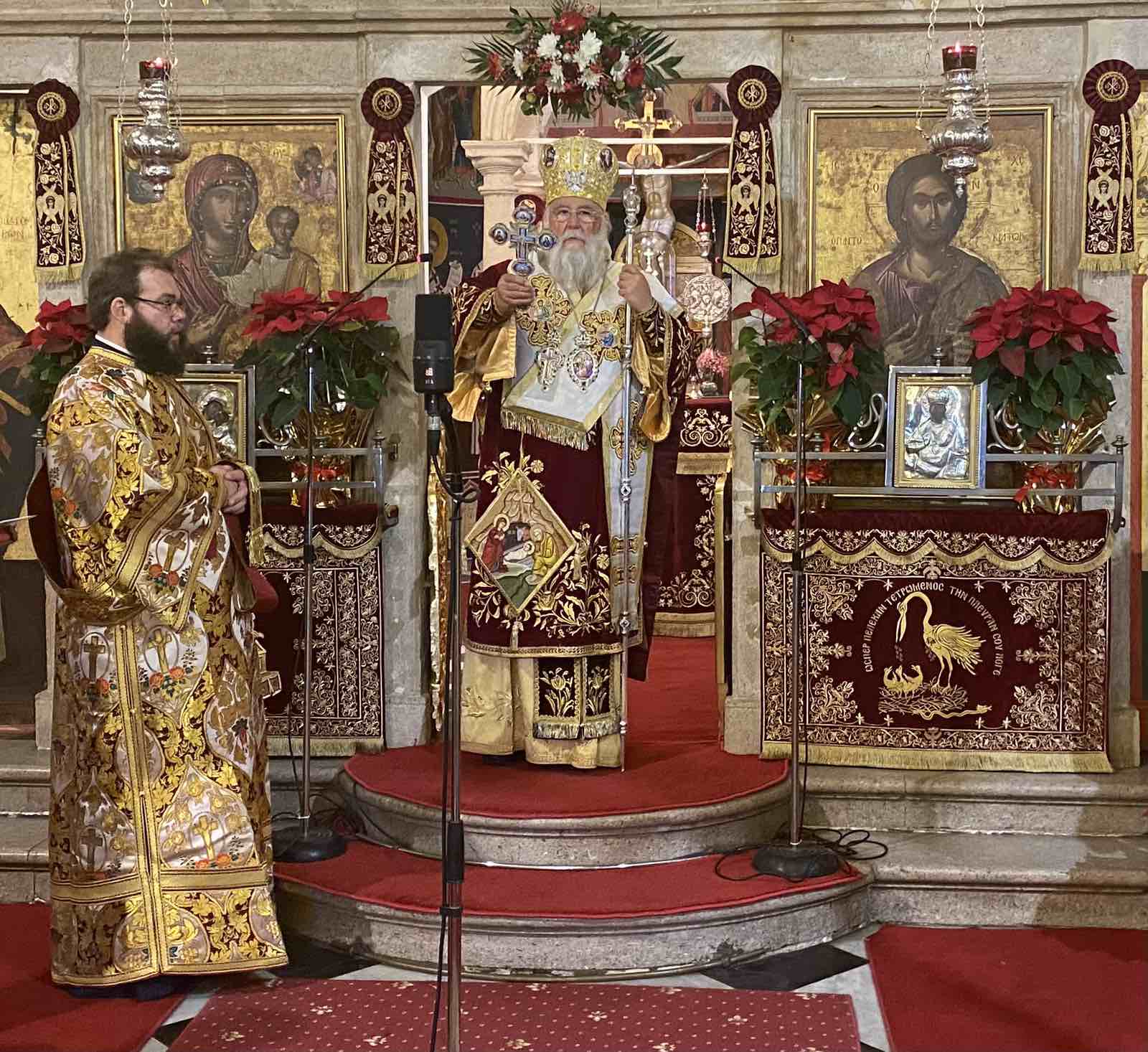 Στο τέλος της Θείας Λειτουργίας, ο Σεβασμιώτατος ευχήθηκε στις αρχές του τόπου και στο λαό του Θεού, το άκτιστον φως του Θεοδέγμωνος Σπηλαίου της Βηθλεέμ, να διαλύσει τα πνευματικά σκοτάδια της ανθρωπότητος και ιδιαίτερα της πατρίδας μας, η οποία φαίνεται σε τούτους τους καιρούς να παρακμάζει πνευματικά. Η Ειρήνη, την οποία ανήγγειλαν οι άγγελοι να επικρατήσει σε όλη την ανθρωπότητα, προκειμένου να κατασιγαστούν οι πόλεμοι και οι αναταράξεις των λαών, η χαρά την οποία δοκίμασαν οι ποιμένες, να απλωθεί σε όλο τον κόσμο, αντί της λύπης και των ποικίλων δοκιμασιών που εξαιτίας της αμαρτίας μας απλώθηκε, και η Δικαιοσύνη να πρυτανεύσει στις καρδιές των αρχόντων του κόσμου, έτσι ώστε να παύσει η αδικία των λαών.