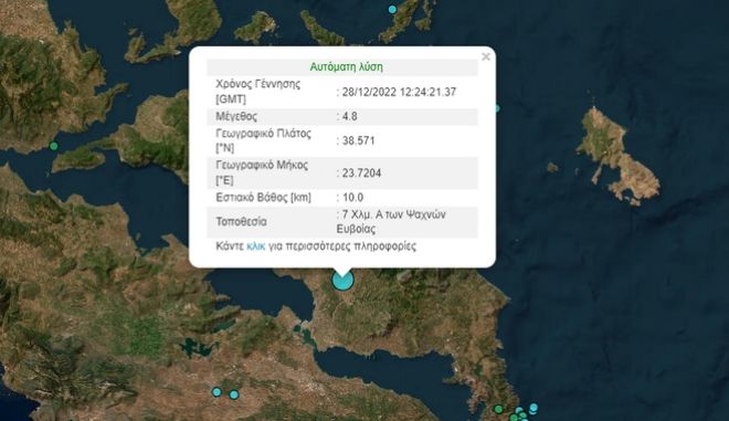 Ισχυρός σεισμός μεγέθους 4,9 βαθμών της κλίμακας Ρίχτερ σημειώθηκε στις 14:24 το μεσημέρι της Τετάρτης (28/12) στην κεντρική Εύβοια.