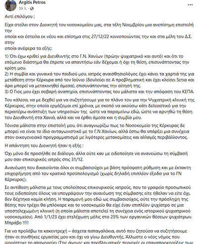 Σε κείμενό του που ανήρτησε στο λογαριασμό του στο Facebook, περιγράφει το τι προηγήθηκε ώστε να έρθει η 1η Ιανουαρίου όπου έληξε χωρίς να ανανεωθεί η σύμβασή του, με τον ίδιο να επιδιώκει να μείνει στην Κέρκυρα παρά το γεγονός ότι έχει δεχθεί πιεστική πρόταση από το Νοσοκομείο Χανίων να αναλάβει διευθυντής στην εκεί ψυχιατρική κλινική!