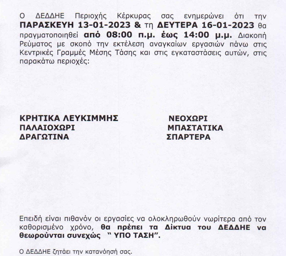 ΚΟΙΝΩΝΙΑΕΛΕΥΘΕΡΟΕΙΔΗΣΕΙΣ Έρχεται διήμερο πολύωρων διακοπών ρεύματος σε περιοχές του Νότου Οι διακοπές ρεύματος είναι προγραμματισμένες για την Παρασκευή 13/1 και τη Δευτέρα 16/1 Last updated: 05/10/2025 22:42 CorfuPress.com Published: 10/01/2023 Share SHARE Οι διακοπές ρεύματος είναι προγραμματισμένες για την Παρασκευή 13/1 και τη Δευτέρα 16/1 Διακοπή ρεύματος τη Δευτέρα-Δείτε που Που θα γίνει διακοπή ρεύματος την Τετάρτη Που θα γίνει διακοπή ρεύματος την Τετάρτη Που θα γίνουν προγραμματισμένες διακοπές ρεύματος το διάστημα 23-25 Αυγούστου Έρχεται διακοπή ρεύματος στη Βόρεια Κέρκυρα Share This Article Facebook Whatsapp Whatsapp Email Copy Link Print Previous Article Εκκίνηση: Προσχηματική η σύσκεψη της Υδραίου για το Νοσοκομείο Next Article Καλούδης: Πυροτέχνημα συγκάληψης ευθυνών η σύσκεψη της κ. Υδραίου Δεν υπάρχουν Σχόλια Δεν υπάρχουν Σχόλια Αφήστε μια απάντηση Ακύρωση απάντησηςΗ ηλ. διεύθυνση σας δεν δημοσιεύεται. Τα υποχρεωτικά πεδία σημειώνονται με *Σχόλιο * Όνομα * Email * Ιστότοπος Αποθήκευσε το όνομά μου, email, και τον ιστότοπο μου σε αυτόν τον πλοηγό για την επόμενη φορά που θα σχολιάσω. ΑναζήτησηΑναζήτησηRecent PostsΌλα τα μάτια στον Θοδωρή, τον καπετάνιο μας! Τη Δευτέρα 22 Σεπτεμβρίου γιορτάζει… Σαν Σήμερα 22/9: Τα σημαντικότερα γεγονότα… Η πρόγνωση του καιρού Έφηβοι Ιονίου: Με περίπατο, συνεχίζουν στο Rising Stars! Recent CommentsΧωρίς σχόλια για εμφάνιση.