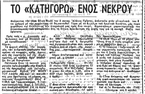 «Ιστορική, ηθική και ανθρώπινη υποχρέωση μας επιβάλλει», ανέφερε, «να ξαναδημοσιεύσουμε το κείμενο της αποφάσεως που επέβαλλε στον τότε διευθυντή μας αείμνηστο συναγ. Αλέκο Πρίφτη ΠΕΝΤΕΜΙΣΥ ΧΡΟΝΙΑ ΕΙΡΚΤΗ γιατί καταγγέλθηκε η καταστροφική για το Έθνος μας πολιτεία μιας ξένης δυναστείας. Η απόφαση αυτή τον εξηνάγκασε να φύγει για να σώσει την προσωπική του ελευτεριά και να βρει τραγικό θάνατο. Την παραδίδουμε γι’ αυτό στην αδέκαστη λαϊκή κρίση που πρέπει να βγάλει τα συμπεράσματά της».