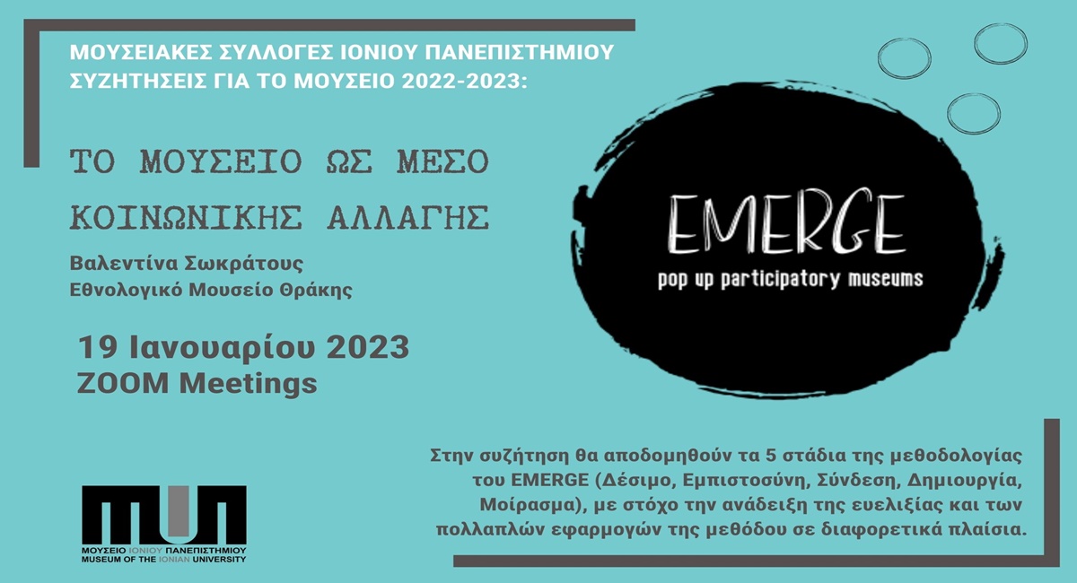 Πως η δημιουργία ενός εφήμερου συμμετοχικού μουσείου, ενισχύει την προσπάθεια για κοινωνική αλλαγή σε θέματα που αφορούν την τοπική κοινότητα από την τοπική κοινότητα; Το πάντρεμα της κοινωνικοπολιτισμικής εμψύχωσης με την Μουσειολογία και την Μουσειοπαιδαγωγική είναι ο πυρήνας της μεθόδου Emerge. Στην συζήτηση θα αποδομηθούν τα πέντε στάδια της προσέγγισης αυτής: 1.Δέσιμο 2.Εμπιστοσύνη 3.Σύνδεση 4.Δημιουργία 5.Μοίρασμα, με στόχο την ανάδειξη της ευελιξίας και των πολλαπλών εφαρμογών της μεθόδου σε διαφορετικά πλαίσια.