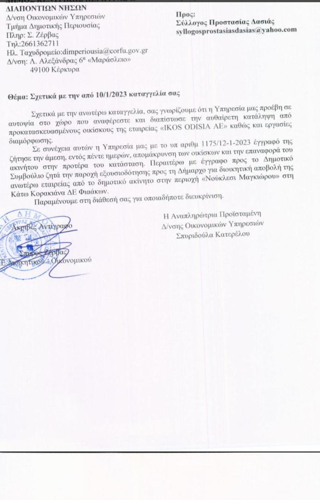 Το αποτέλεσμα της αυτοψίας των υπηρεσιών του Δήμου γνωστοποίησε ο Συλλογος προστασίας και ανάδειξης Δασιάς που είχε πραγματοποιήσει την καταγγελία μαζί με το δημοτικό σύμβουλο κ. Βασιλάκη