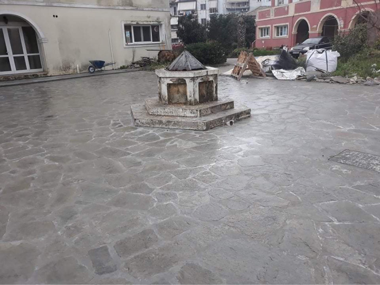 • Τοποθέτηση ακανόνιστων πλακών τύπου Καρύστου στον ακάλυπτο χώρο μεταξύ των κτιρίων και στον χώρο στάθμευση και αρμολόγημα αυτών.