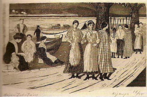 Ακολουθούν – πάνω έργο του με φόντο την κερκυραϊκή λιμνοθάλασσα Χαλικιόπουλου – αποσπάσματα από το πρώτο άρθρο του, με τίτλο «Στους αριστοκράτες», που δημοσιεύτηκε τις 21-10-1907 (αρ. φ. 266, σελ. 4-5):
