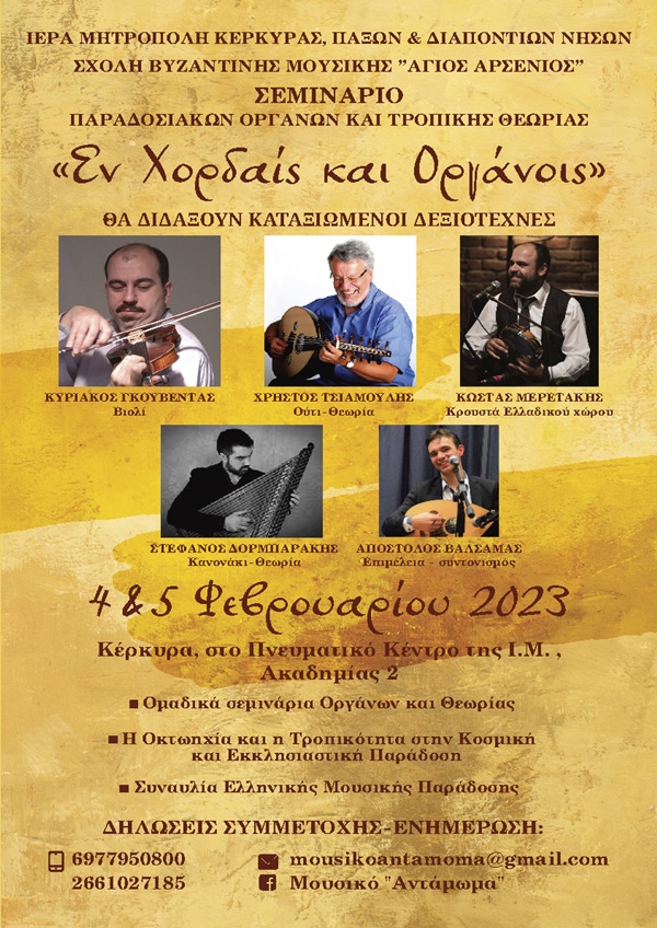 Η σχολή Βυζαντινής μουσικής της Ι.Μ.Κερκύρας Παξών και Διαποντίων Νήσων, “Ο Άγιος Αρσένιος” και το τμήμα Παραδοσιακών Οργάνων, οργανώνει σεμινάριο Παραδοσιακής Μουσικής με εξαίρετους καλλιτέχνες του Ελλαδικού χώρου.