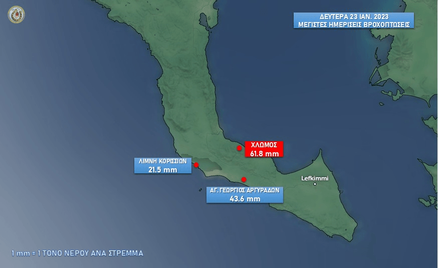Εξάλλου, από τις βραδινές ώρες της Κυριακής 22/01 έως και το βράδυ της Δευτέρας 23/01 εκδηλώθηκαν στο νησί μας αρκετές βροχοπτώσεις με τους μετεωρολογικούς σταθμούς να καταγράφουν ενδεικτικά τις ακόλουθες ποσότητες: