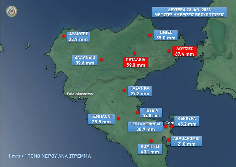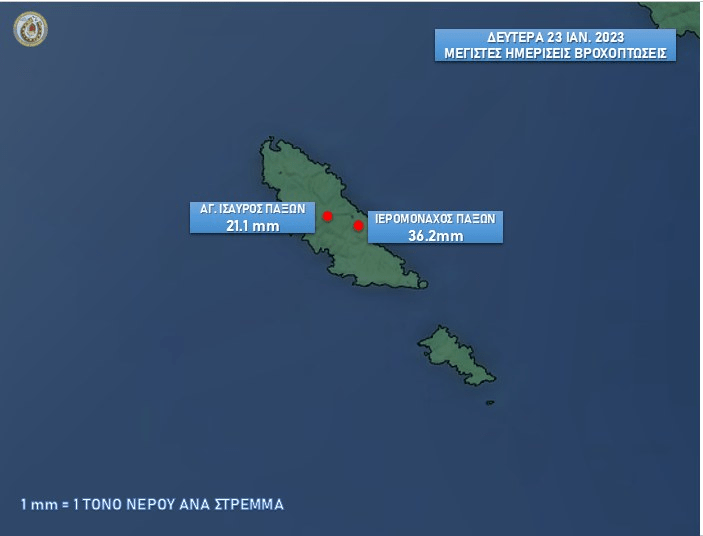 Εξάλλου, από τις βραδινές ώρες της Κυριακής 22/01 έως και το βράδυ της Δευτέρας 23/01 εκδηλώθηκαν στο νησί μας αρκετές βροχοπτώσεις με τους μετεωρολογικούς σταθμούς να καταγράφουν ενδεικτικά τις ακόλουθες ποσότητες: