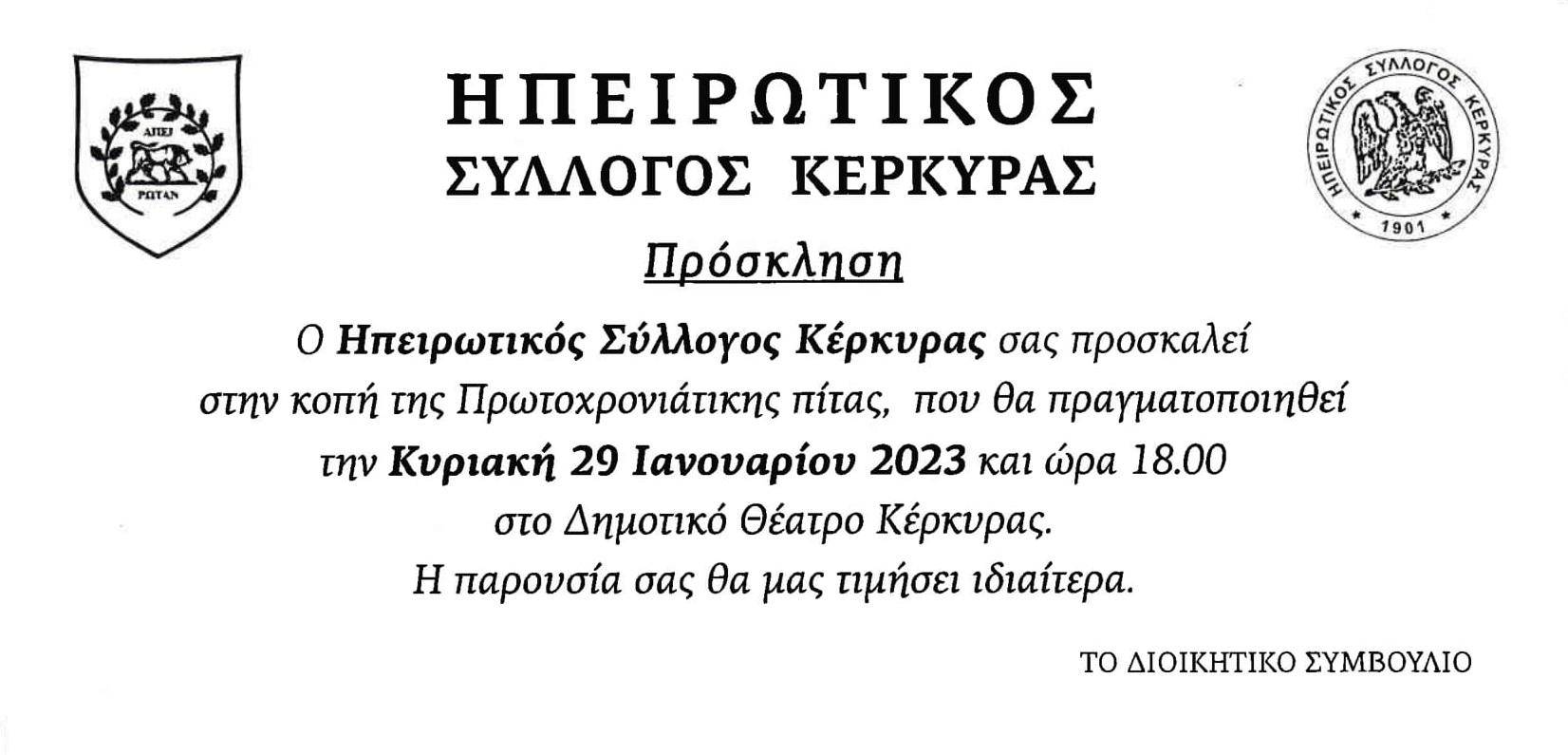 Ο Ηπειρωτικός Σύλλογος Κέρκυρας σας προσκαλεί στην κοπή της Πρωτοχρονιάτικης πίτας, που θα πραγματοποιηθεί την Κυριακή 29 Ιανουαρίου 2023 και ώρα 18.00 στο Δημοτικό Θέατρο Κέρκυρας.
