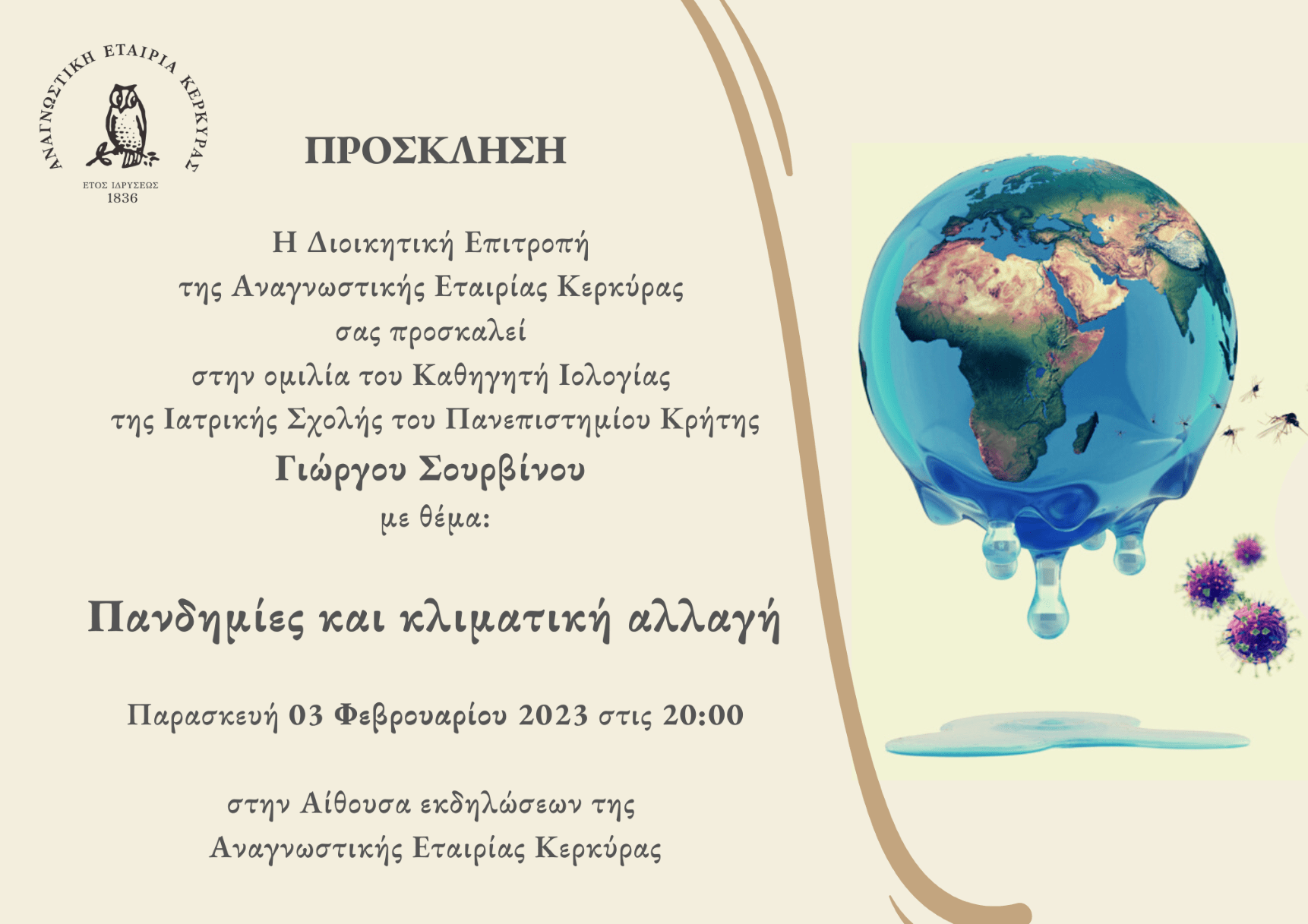 Η Δ.Ε. της Αναγνωστικής Εταιρίας Κερκύρας σας προσκαλεί στην ομιλία του Καθηγητή Ιολογίας της Ιατρικής Σχολής του Πανεπιστημίου Κρήτης Γιώργου Σουρβίνου, με θέμα: «Πανδημίες και κλιματική αλλαγή»