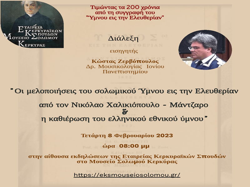 Η Εταιρεία Κερκυραϊκών Σπουδών -Μουσείο Σολωμού Κερκύρας, τιμώντας την επέτειο των διακοσίων χρόνων από τη συγγραφή του «Ύμνου εις την Ελευθερίαν» εγκαινιάζει σειρά εκδηλώσεων γι αυτή τη θεματική και σας προσκαλεί στη διάλεξη του Κώστα Ζερβόπουλου, Δρ. Μουσικολογίας του Ιονίου Πανεπιστημίου με θέμα: «Οι μελοποιήσεις του σολωμικού “Ύμνου εις την Ελευθερίαν” από τον Νικόλαο Χαλικιόπουλο-Μάντζαρο και η καθιέρωση του ελληνικού εθνικού ύμνου».