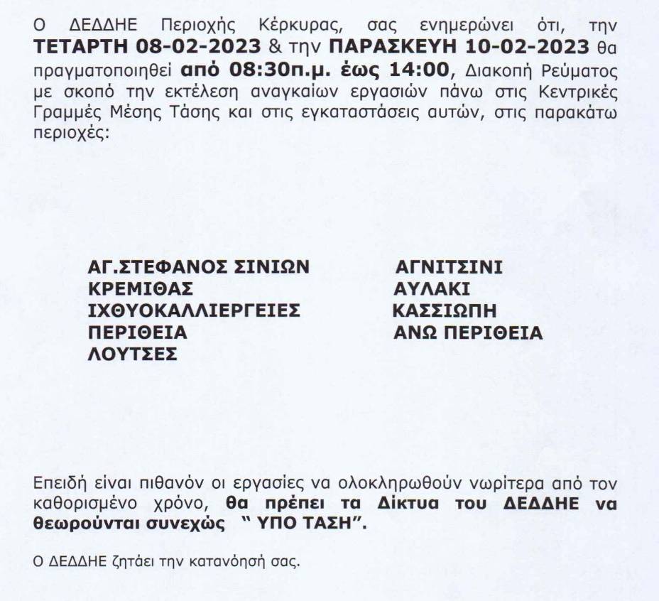 Οι διακοπές ρεύματος θα πραγματοποιηθούν την Τετάρτη και την Παρασκευή, για περισσότερες από πέντε ώρες τη φορά.