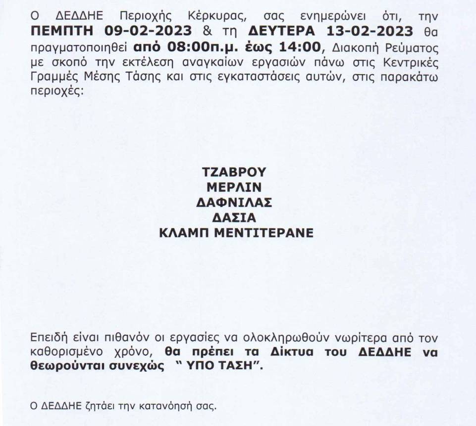 Αιτία των διακοπών που θα γίνουν την Πέμπτη και την Δευτέρα είναι η εκτέλεση αναγκαίων εργασιών στις κεντρικές γραμμές μέσης τάσης.