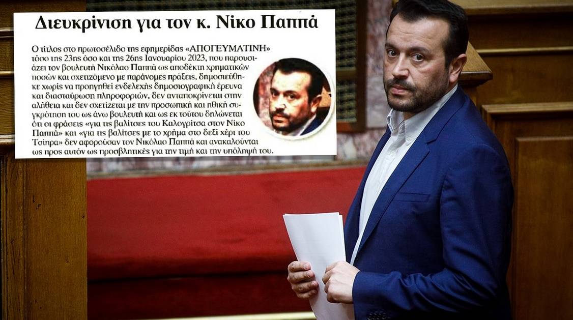 «Ο τίτλος στο πρωτοσέλιδο της εφημερίδας «ΑΠΟΓΕΥΜΑΤΙΝΗ» τόσο της 23ης, όσο και της 26ης Ιανουαρίου 2023, που παρουσιάζει τον βουλευτή Νικόλαο Παππά ως αποδέκτη χρηματικών ποσών και σχετιζόμενο με παράνομες πράξεις, δημοσιεύτηκε χωρίς να προηγηθεί ενδελεχής δημοσιογραφική έρευνα και διασταύρωση πληροφοριών, δεν ανταποκρίνεται στην αλήθεια και δεν σχετίζεται με την προσωπική και ηθική συγκρότηση του ως άνω βουλευτή και ως εκ τούτου δηλώνεται ότι οι φράσεις «για τις βαλίτσες του Καλογρίτσα στον Νίκο Παππά» και «για τις βαλίτσες με το χρήμα στο δεξί χέρι του Τσίπρα» δεν αφορούσαν τον Νικόλαο Παππά και ανακαλούνται ως προς αυτόν ως προσβλητικές για την τιμή και την υπόληψή του», αναφέρει το σχετικό δημοσίευμα υπό τον τίτλο: «Διευκρίνιση για τον κ. Νίκο Παππά».