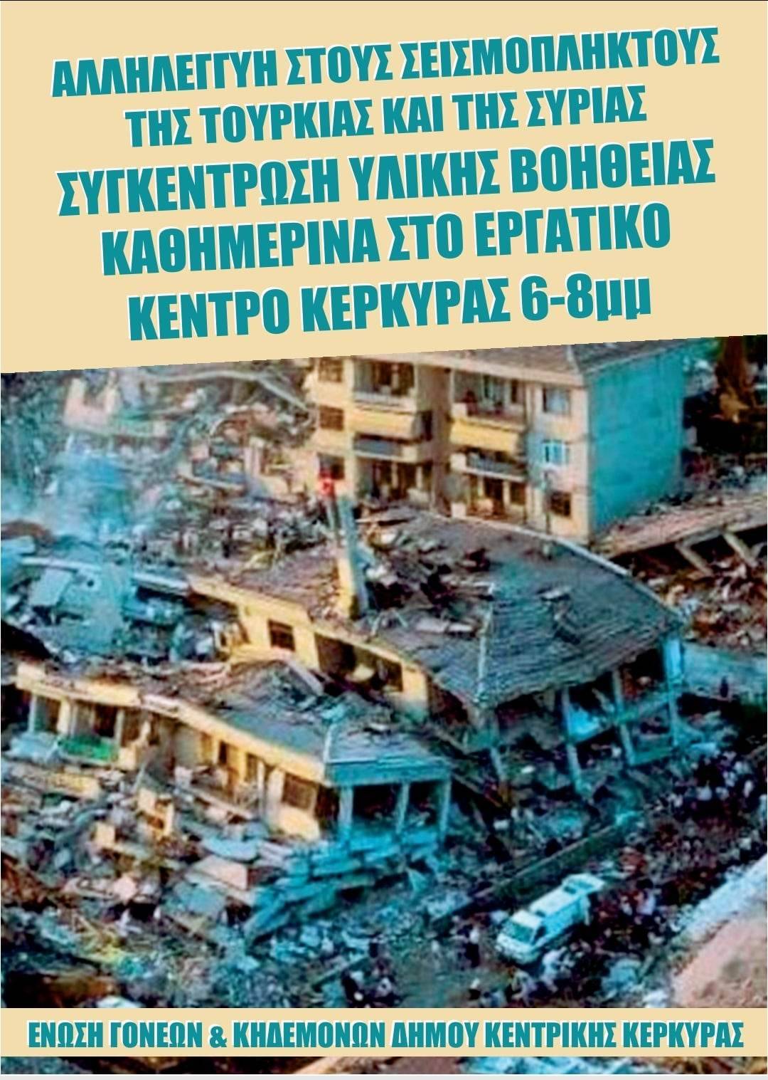 Η Ένωση Συλλόγων Γονέων και Κηδεμόνων Κεντρικής Κέρκυρας, ύστερα από την μεγάλη καταστροφή που υπέστη ο λαός της Τουρκίας και της Συρίας λόγω του σεισμού, καλεί τους Συλλόγους Γονέων και Κηδεμόνων να προβούν στη συλλογή ειδών πρώτης ανάγκης στηρίζοντας έμπρακτα το λαό της γειτονικής χώρας.