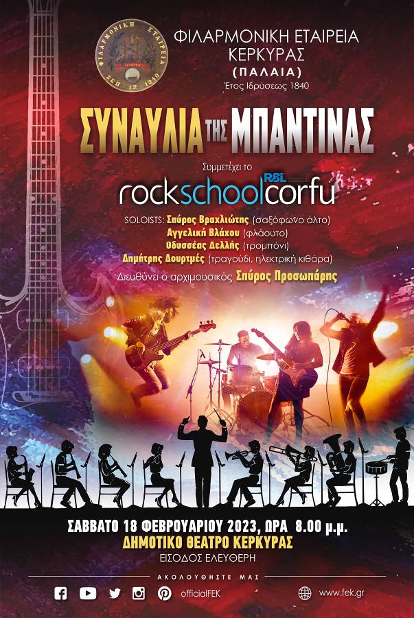 Η συναυλία της μπαντίνας της Φιλαρμονικής Εταιρείας Κερκύρας στο Δημοτικό Θέατρο στις 18 Φεβρουαρίου 2023 θα ξεκινήσει στις 20:00 και θα έχει ελεύθερη είσοδο.