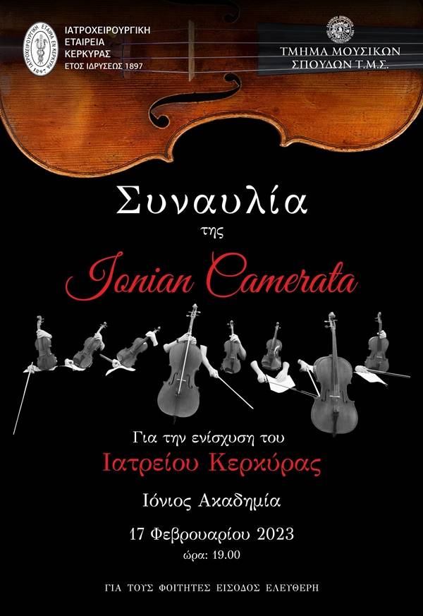 H Iατροχειρουργική Εταιρεία Κέρκυρας και το Τμήμα Μουσικών Σπουδών ΤΜΣ συνδιοργανώνουν συναυλία της Ionian Camerata για την ενίσχυση του Ιατρείου Κέρκυρας.