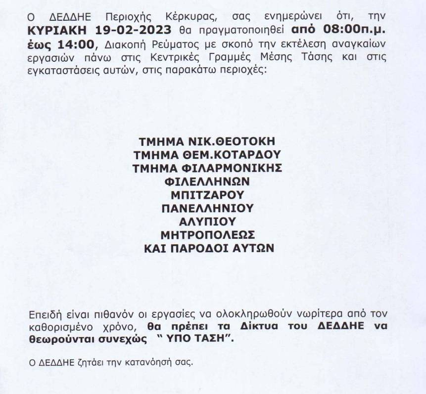 ΚΟΙΝΩΝΙΑΕΛΕΥΘΕΡΟΕΙΔΗΣΕΙΣ Έρχεται πολύωρη διακοπή την Κυριακή, σε σημεία της πόλης Αιτία της διακοπής θα είναι οι εργασίες που θα γίνουν πάνω στις κεντρικές γραμμές μέσης τάσης. Last updated: 16/02/2023 15:25 CorfuPress.com Published: 16/02/2023 Share SHARE Αιτία της διακοπής θα είναι οι εργασίες που θα γίνουν πάνω στις κεντρικές γραμμές μέσης τάσης. Διακοπή ρεύματος τη Δευτέρα-Δείτε που Που θα γίνει διακοπή ρεύματος την Τετάρτη Που θα γίνει διακοπή ρεύματος την Τετάρτη Που θα γίνουν προγραμματισμένες διακοπές ρεύματος το διάστημα 23-25 Αυγούστου Έρχεται διακοπή ρεύματος στη Βόρεια Κέρκυρα Share This Article Facebook Whatsapp Whatsapp Email Copy Link Print Previous Article Ο Κεντρικός Δήμος, στην Εθνική Ομάδα Εργασίας για το Europe Goes Local – Erasmus+ Next Article Γκίκας: To Υπ. Περιβάλλοντος επιλύει το ιδιοκτησιακό των δασικών εκτάσεων στα Ιόνια Δεν υπάρχουν Σχόλια Δεν υπάρχουν Σχόλια Αφήστε μια απάντηση Ακύρωση απάντησηςΗ ηλ. διεύθυνση σας δεν δημοσιεύεται. Τα υποχρεωτικά πεδία σημειώνονται με *Σχόλιο * Όνομα * Email * Ιστότοπος Αποθήκευσε το όνομά μου, email, και τον ιστότοπο μου σε αυτόν τον πλοηγό για την επόμενη φορά που θα σχολιάσω. ΑναζήτησηΑναζήτησηRecent PostsΌλα τα μάτια στον Θοδωρή, τον καπετάνιο μας! Τη Δευτέρα 22 Σεπτεμβρίου γιορτάζει… Σαν Σήμερα 22/9: Τα σημαντικότερα γεγονότα… Η πρόγνωση του καιρού Έφηβοι Ιονίου: Με περίπατο, συνεχίζουν στο Rising Stars! Recent CommentsΧωρίς σχόλια για εμφάνιση.