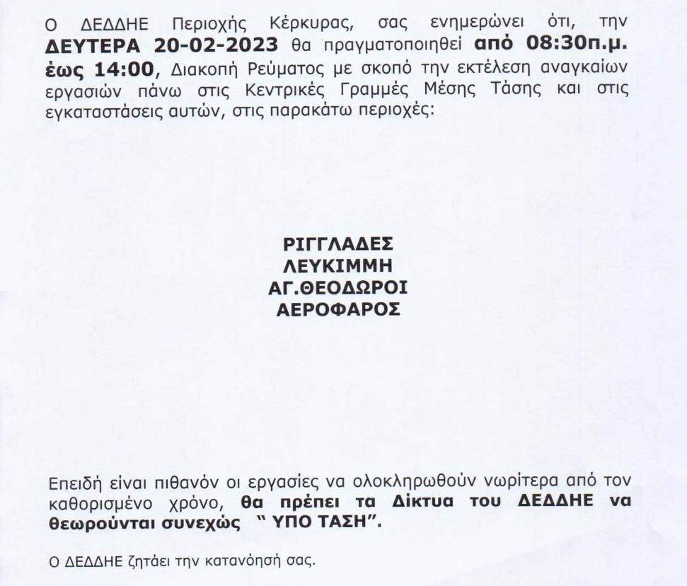 ΚΟΙΝΩΝΙΑΕΛΕΥΘΕΡΟΕΙΔΗΣΕΙΣ Πολύωρη διακοπή ρεύματος στο νότο, την Δευτέρα Η διακοπή ρεύματος θα πραγματοποιηθεί λόγω εργασιών πάνω στις κεντρικές γραμμές μέσης τάσης. Last updated: 17/02/2023 09:37 CorfuPress.com Published: 17/02/2023 Share SHARE Η διακοπή ρεύματος θα πραγματοποιηθεί λόγω εργασιών πάνω στις κεντρικές γραμμές μέσης τάσης. Διακοπή ρεύματος τη Δευτέρα-Δείτε που Που θα γίνει διακοπή ρεύματος την Τετάρτη Που θα γίνει διακοπή ρεύματος την Τετάρτη Που θα γίνουν προγραμματισμένες διακοπές ρεύματος το διάστημα 23-25 Αυγούστου Έρχεται διακοπή ρεύματος στη Βόρεια Κέρκυρα Share This Article Facebook Whatsapp Whatsapp Email Copy Link Print Previous Article Γενική συνέλευση και κοπή πίτας για τους Συνταξιούχους του ΙΚΑ Next Article Για νέα νίκη ο Αστέρας, κρίσιμη έξοδος για ΑΕΛ! Δεν υπάρχουν Σχόλια Δεν υπάρχουν Σχόλια Αφήστε μια απάντηση Ακύρωση απάντησηςΗ ηλ. διεύθυνση σας δεν δημοσιεύεται. Τα υποχρεωτικά πεδία σημειώνονται με *Σχόλιο * Όνομα * Email * Ιστότοπος Αποθήκευσε το όνομά μου, email, και τον ιστότοπο μου σε αυτόν τον πλοηγό για την επόμενη φορά που θα σχολιάσω. ΑναζήτησηΑναζήτησηRecent PostsΌλα τα μάτια στον Θοδωρή, τον καπετάνιο μας! Τη Δευτέρα 22 Σεπτεμβρίου γιορτάζει… Σαν Σήμερα 22/9: Τα σημαντικότερα γεγονότα… Η πρόγνωση του καιρού Έφηβοι Ιονίου: Με περίπατο, συνεχίζουν στο Rising Stars! Recent CommentsΧωρίς σχόλια για εμφάνιση.