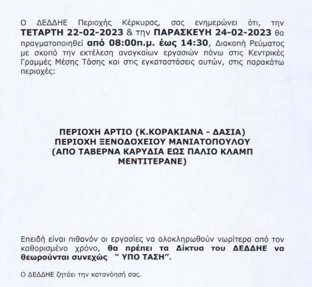 ΚΟΙΝΩΝΙΑΕΛΕΥΘΕΡΟΕΙΔΗΣΕΙΣ Νέες πολύωρες διακοπές ρεύματος σε Κορακιάνα-Δασιά Οι διακοπές ρεύματος θα πραγματοποιηθούν την Τετάρτη και την Παρασκευή λόγω εργασιών. Last updated: 20/02/2023 16:19 CorfuPress.com Published: 20/02/2023 Share SHARE Οι διακοπές ρεύματος θα πραγματοποιηθούν την Τετάρτη και την Παρασκευή λόγω εργασιών. Διακοπή ρεύματος τη Δευτέρα-Δείτε που Που θα γίνει διακοπή ρεύματος την Τετάρτη Που θα γίνει διακοπή ρεύματος την Τετάρτη Που θα γίνουν προγραμματισμένες διακοπές ρεύματος το διάστημα 23-25 Αυγούστου Έρχεται διακοπή ρεύματος στη Βόρεια Κέρκυρα Share This Article Facebook Whatsapp Whatsapp Email Copy Link Print Previous Article Συνέντευξη Γκίκα στο Αθηναϊκό – Μακεδονικό Πρακτορείο Ειδήσεων Next Article Την Παρασκευή, δημοτικό συμβούλιο με 19 θέματα Δεν υπάρχουν Σχόλια Δεν υπάρχουν Σχόλια Αφήστε μια απάντηση Ακύρωση απάντησηςΗ ηλ. διεύθυνση σας δεν δημοσιεύεται. Τα υποχρεωτικά πεδία σημειώνονται με *Σχόλιο * Όνομα * Email * Ιστότοπος Αποθήκευσε το όνομά μου, email, και τον ιστότοπο μου σε αυτόν τον πλοηγό για την επόμενη φορά που θα σχολιάσω. ΑναζήτησηΑναζήτησηRecent PostsΌλα τα μάτια στον Θοδωρή, τον καπετάνιο μας! Τη Δευτέρα 22 Σεπτεμβρίου γιορτάζει… Σαν Σήμερα 22/9: Τα σημαντικότερα γεγονότα… Η πρόγνωση του καιρού Έφηβοι Ιονίου: Με περίπατο, συνεχίζουν στο Rising Stars! Recent CommentsΧωρίς σχόλια για εμφάνιση.