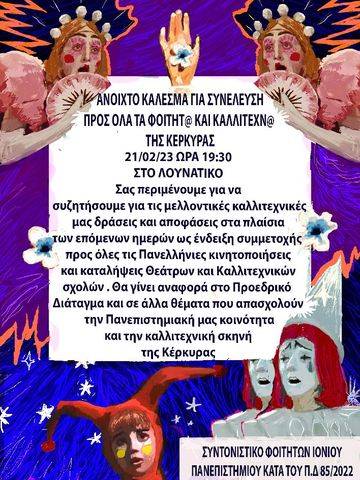 Ανοικτό κάλεσμα του Συντονιστικού Φοιτητών Ιονίου Πανεπιστημίου κατά του Π.Δ. 85/2022 για συνέλευση προς τις καλλιτεχνικές ομάδες και τους καλλιτέχνες της Κέρκυρας.