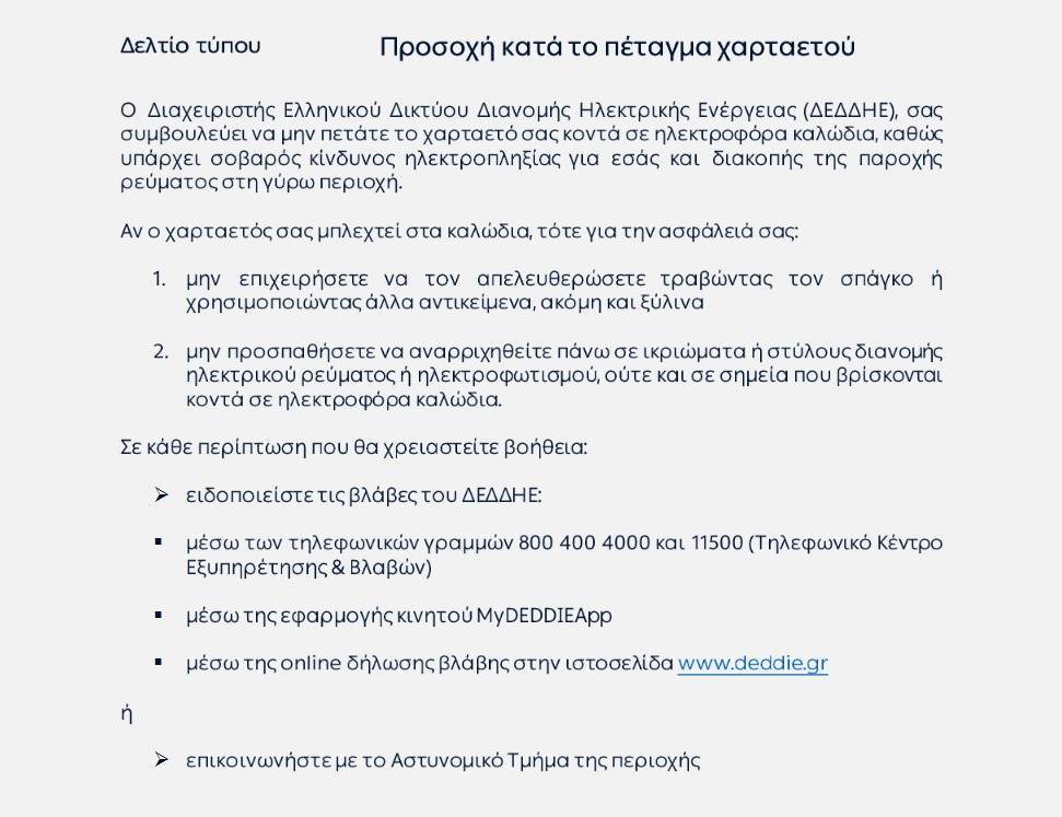Μήνυμα του ΔΕΔΔΗΕ προς τους πολίτες ώστε να είναι προσεκτικοί κατά το πέταγμα του χαρταετού. - Τι να κάνετε αν χρειαστείτε βοήθεια.