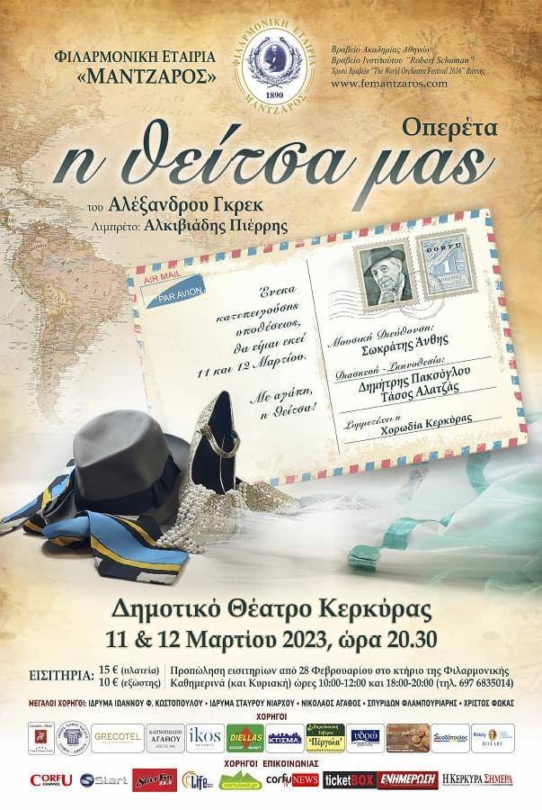 Η «Φιλαρμονική Εταιρία Μάντζαρος» στις 11 και 12 Μαρτίου 2023, στο Δημοτικό Θέατρο Κερκυρας και ώρα 20:30μμ, θα πραγματοποιήσει δύο παραστάσεις της οπερέτας του σπουδαίου μουσικοδιδάσκαλου και συνθέτη Αλέξανδρου Γκρεκ «Η Θείτσα μας».