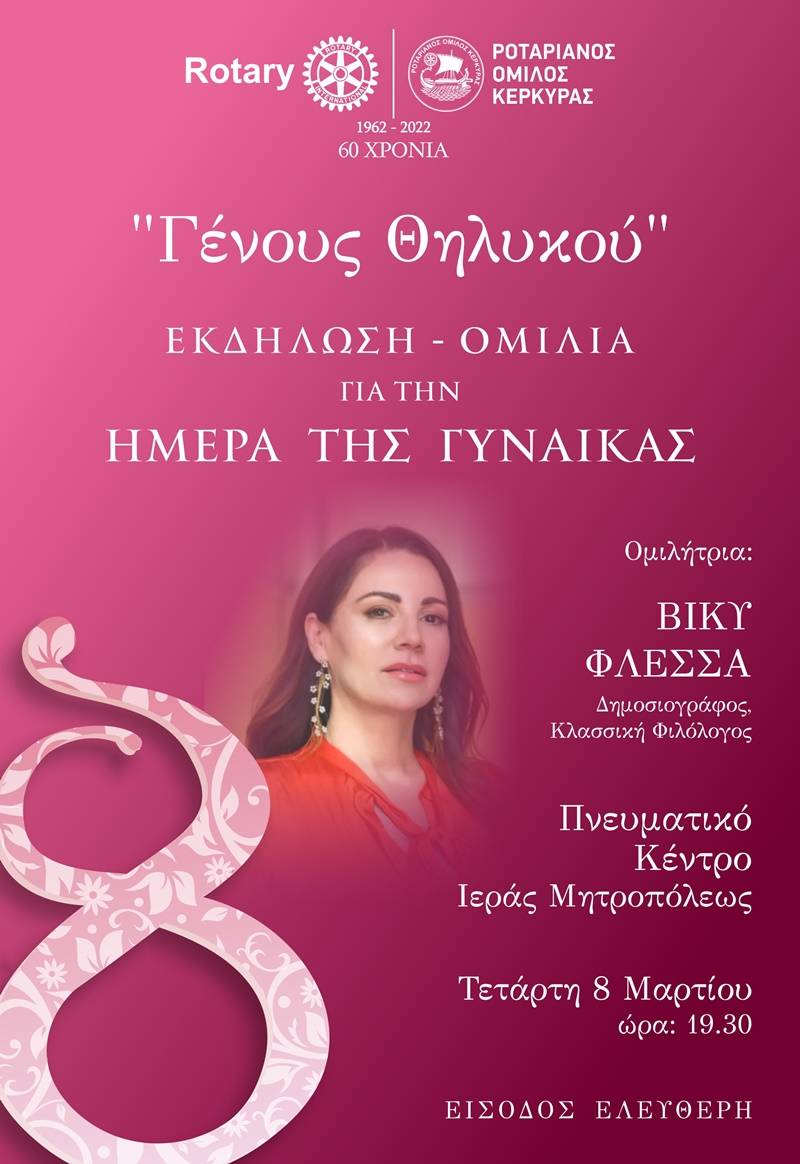 Eκδήλωση διοργανώνει ο Ροταριανός Όμιλος Κέρκυρας στο πλαίσιο του εορτασμού της Ημέρας της Γυναίκας.