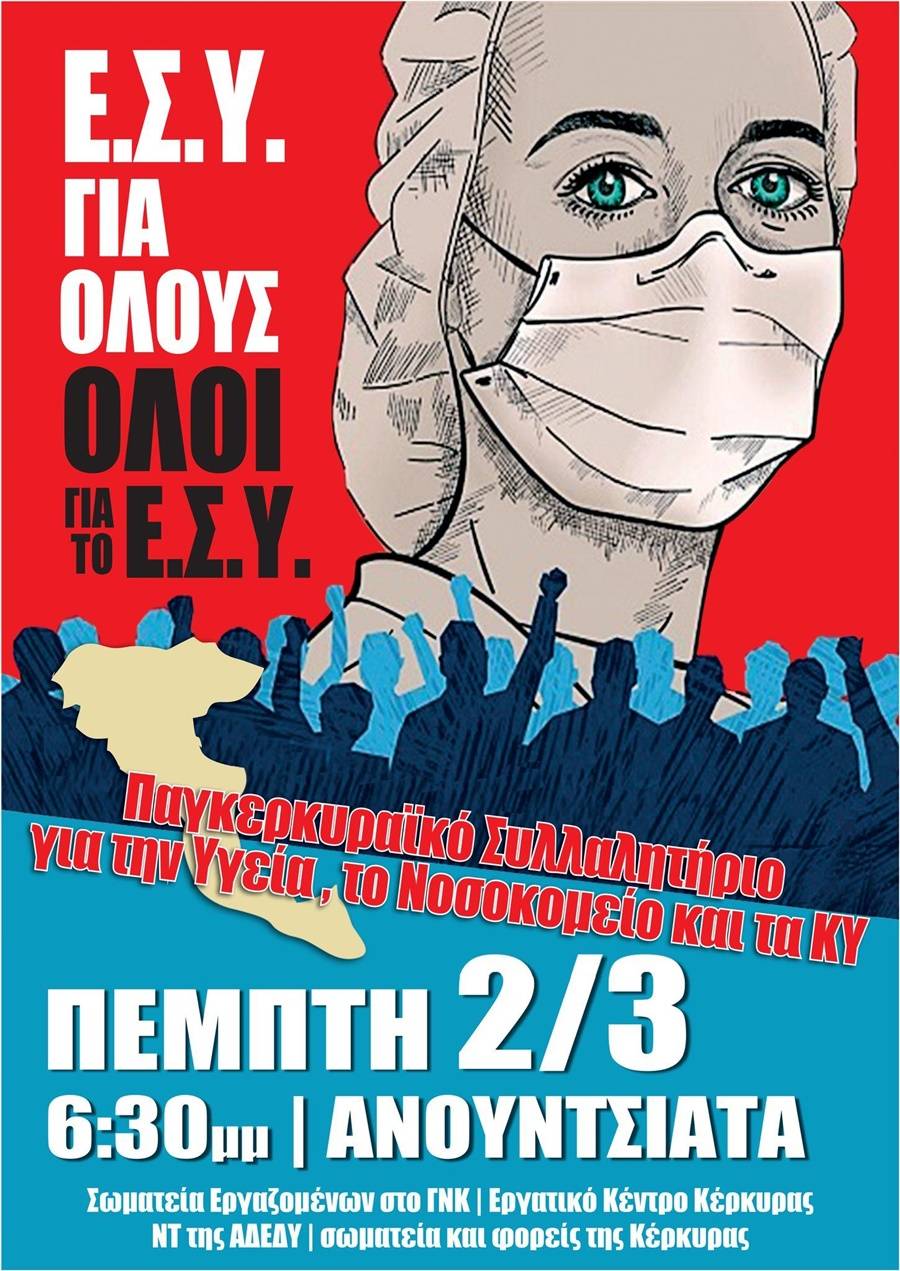 Συμμετέχουμε στο μεγάλο συλλαλητήριο, που θα πραγματοποιηθεί για την Υγεία και το Νοσοκομείο της Κέρκυρας, την Πέμπτη 2 Μαρτίου, στις 6:30 μ.μ., στην Ανουντσιάτα, όπως αποφασίστηκε στην κοινή σύσκεψη των σωματείων.