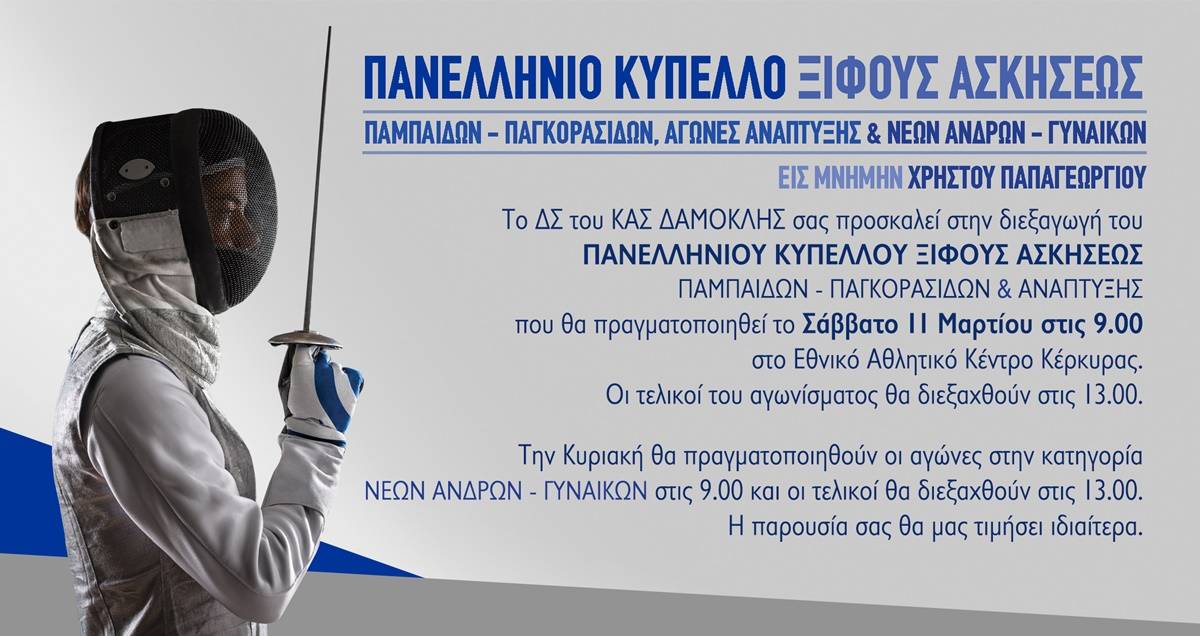 Βρισκόμαστε στην τελική φάση των προετοιμασιών για το Πανελλήνιο Κύπελλο Παμπαίδων Παγκορασίδων & Ανάπτυξης και Νέων Ανδρών – Νέων Γυναικών εις μνήμην Χρήστου Παπαγεωργίου που διοργανώνει ο ΚΑΣ ΔΑΜΟΚΛΗΣ ,11-12 Μαρτίου στο ΕΑΚ Κέρκυρας.