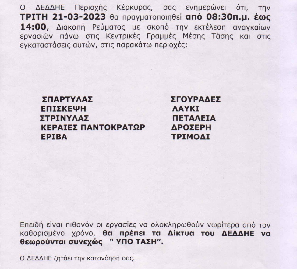 ΚΟΙΝΩΝΙΑΕΛΕΥΘΕΡΟΕΙΔΗΣΕΙΣ Έρχεται πολύωρη διακοπή ρεύματος στο βορρά Η διακοπή θα πραγματοποιηθεί για να γίνουν αναγκαίες εργασίες από το ΔΕΔΔΗΕ. Last updated: 05/10/2025 23:48 CorfuPress.com Published: 17/03/2023 Share SHARE Η διακοπή θα πραγματοποιηθεί για να γίνουν αναγκαίες εργασίες από το ΔΕΔΔΗΕ. Διακοπή ρεύματος τη Δευτέρα-Δείτε που Που θα γίνει διακοπή ρεύματος την Τετάρτη Που θα γίνει διακοπή ρεύματος την Τετάρτη Που θα γίνουν προγραμματισμένες διακοπές ρεύματος το διάστημα 23-25 Αυγούστου Έρχεται διακοπή ρεύματος στη Βόρεια Κέρκυρα Share This Article Facebook Whatsapp Whatsapp Email Copy Link Print Previous Article Αντιπολίτευση: Nα γίνει σήμερα το δημοτικό συμβούλιο για το νερό Next Article Κατώτατος μισθός 2023: Ο υπολογισμός στα «καθαρά» Δεν υπάρχουν Σχόλια Δεν υπάρχουν Σχόλια Αφήστε μια απάντηση Ακύρωση απάντησηςΗ ηλ. διεύθυνση σας δεν δημοσιεύεται. Τα υποχρεωτικά πεδία σημειώνονται με *Σχόλιο * Όνομα * Email * Ιστότοπος Αποθήκευσε το όνομά μου, email, και τον ιστότοπο μου σε αυτόν τον πλοηγό για την επόμενη φορά που θα σχολιάσω. ΑναζήτησηΑναζήτησηRecent PostsΌλα τα μάτια στον Θοδωρή, τον καπετάνιο μας! Τη Δευτέρα 22 Σεπτεμβρίου γιορτάζει… Σαν Σήμερα 22/9: Τα σημαντικότερα γεγονότα… Η πρόγνωση του καιρού Έφηβοι Ιονίου: Με περίπατο, συνεχίζουν στο Rising Stars! Recent CommentsΧωρίς σχόλια για εμφάνιση.