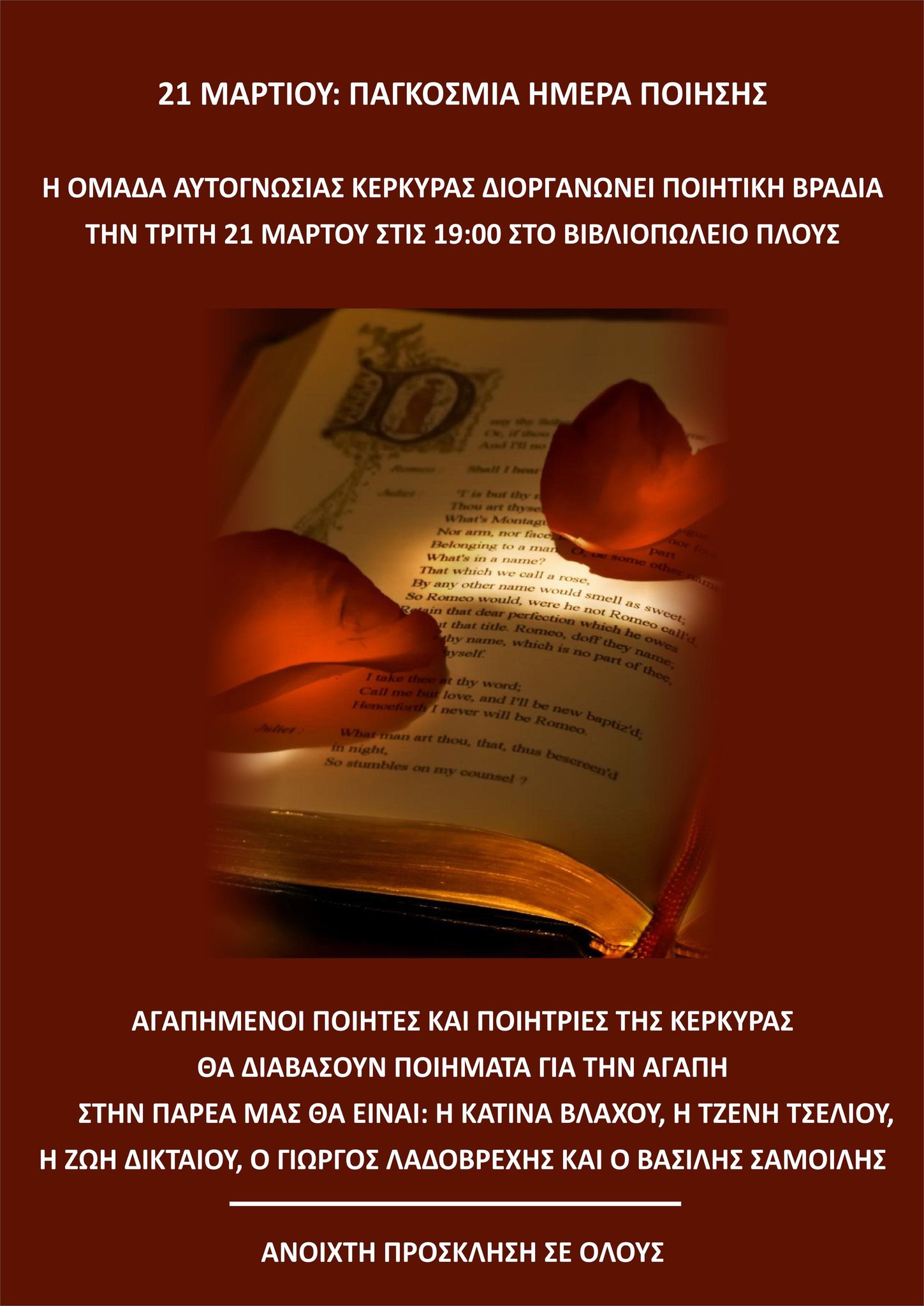 Η ομάδα Αυτογνωσίας Κέρκυρας, ενόψει της Παγκόσμιας ημέρας Ποίησης στις 21 Μαρτίου, διοργανώνει ποιητική βραδιά την Τρίτη 21 Μαρτίου στις 19:00 στο βιβλιοπωλείο Πλους.