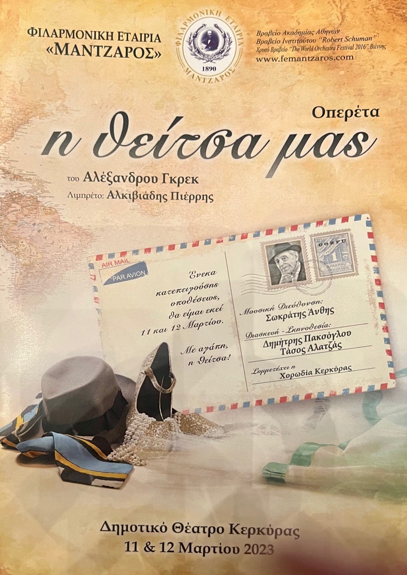 Μια εξαιρετική παράσταση της Φιλαρμονικής Εταιρίας Μάντζαρος (Φ.Ε.Μ.) στην ιστορική αναβίωση -μετά από 71 χρόνια από την 1η παρουσίαση- της οπερέτας «η θείτσα μας» του Αλέξανδρου Γκρεκ, την οποία προλόγισε ο Πρόεδρος του Δ.Σ. της Φ.Ε.Μ. κ. Ιωάννης Τριβιζάς, απολαύσαμε το Σάββατο και την Κυριακή 11 & 12 Μαρτίου στο κατάμεστο Δημοτικό θέατρο Κέρκυρας.