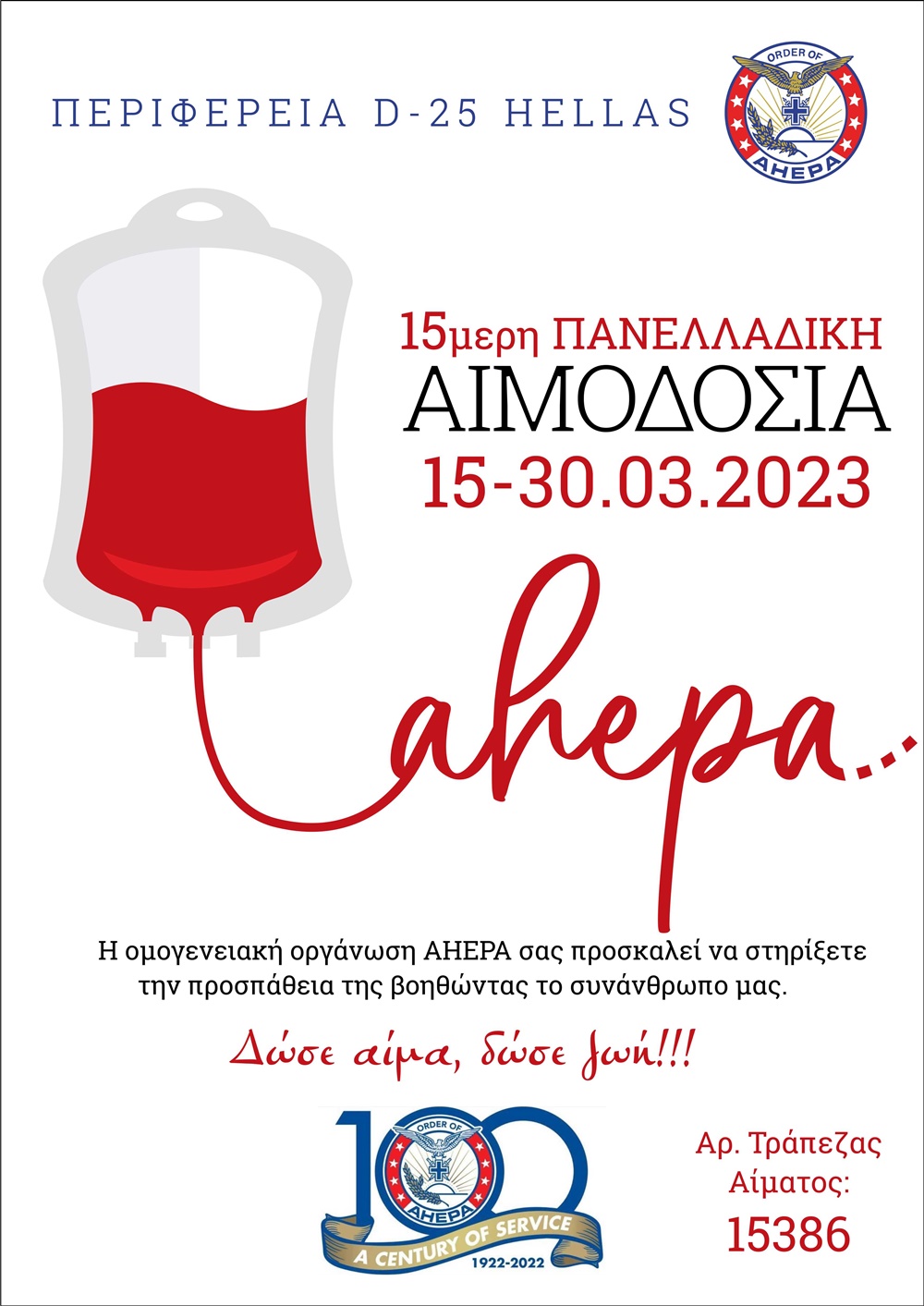 Για μια ακόμη χρονιά η Περιφέρεια 25 της ΑHEPA για την Ελλάδα διοργανώνει Πανελλήνια Εκστρατεία Αιμοδοσίας.