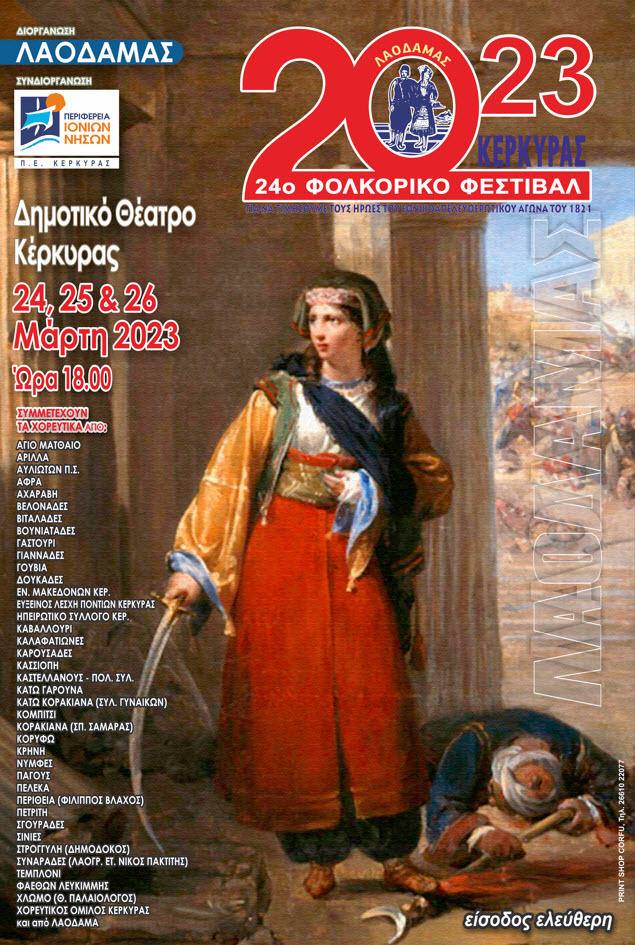 Στο Φεστιβάλ συμμετέχουν 41 χορευτικά τμήματα και σύμφωνα με τους διοργανωτές η εκδήλωση είναι η μαζικότερη πολιτιστική εκδήλωση στο νησί. Μια εκδήλωση θεσμός πια μετά από 23 χρόνια, στην επέτειο ενός μεγάλου εθνικοαπελευθερωτικού αγώνα με πολλαπλά μηνύματα. «Το πραγματικό νόημα της επετείου της Επανάστασης σήμερα είναι αναμφίβολα ότι χωρίς τον επαναστατικό ξεσηκωμό στα 1821 όλων των τότε καταπιεσμένων, δε θα υπήρχε αυτό το ιστορικό γεγονός και το αποτέλεσμά του, η ανατροπή της οθωμανικής, της παλιάς εξουσίας και η εγκαθίδρυση της νέας και σαν αποτέλεσμα είχε την δημιουργία του πρώτου ανεξάρτητου Ελληνικού κράτους. Επίκαιρα μηνύματα με το βασικότερο ότι ο λαός πρέπει να πιστεύει πάντα στο δίκιο και τη δύναμη του αγώνα του. Ότι η ιστορία γράφεται με ανυπακοή και απειθαρχία προς αυτούς που επιβουλεύονται την ελευθερία του, την ίδια του την ζωή» τονίζει ο γραμματέας του Λαοδάμαντα κος Πέρρος Νίκος και συνεχίζει: « Ο Ελληνικός λαός δεν έχει να κερδίσει τίποτε από αυτούς που καλλιεργούν την μοιρολατρία, που τρομοκρατούν με εκβιασμούς ότι δεν γίνεται τίποτε. Και τότε υπήρχαν αυτοί που εχθρεύονταν την επανάσταση και υπερασπίζονταν το παλιό κοινωνικό καθεστώς, το Οθωμανικό σύστημα και την εξουσία του Σουλτάνου γιατί αντλούσαν προνόμια από αυτό. Απαιτούσαν πίστη και υποταγή στην “Ιερή Συμμαχία” των δυναστών τότε. Και σήμερα πρέπει να βγάλει συμπεράσματα από τα μηνύματα του ’21, από τα λόγια και τις πράξεις των Λαϊκών Ηρώων, του Κολοκοτρώνη, του Καραϊσκάκη, του Μακρυγιάννη, του Ρήγα. Η Κέρκυρα τιμά αυτόν τον αγώνα με τον καλύτερο τρόπο, με χορούς και τραγούδια δημιούργημα του ίδιου του λαού, μέσα από τον αγώνα του για επιβίωση, μέσα από τις κοινωνικές του στιγμές, της χαράς ή της λύπης. Εννιακόσιοι και πλέον χορευτές και χορεύτριες όλων των ηλικιών από κάθε γωνιά του νησιού συνοδευόμενοι από ζωντανή μουσική θα παρουσιάσουν ένα καταπληκτικό τριήμερο υπερθέαμα, όπου και η Ελληνική παραδοσιακή φορεσιά θα έχει την τιμητική της. Η Είσοδος είναι ελεύθερη Παρασκευή 24, Σάββατο 25 και Κυριακή 26 Μάρτη από τις 18:00 στο δημοτικό θέατρο.».