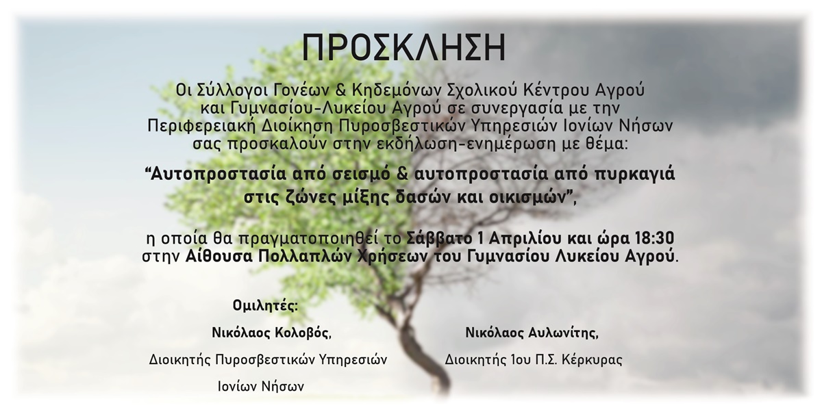 Οι Σύλλογοι Γονέων & Κηδεμόνων Σχολικού Κέντρου Αγρού και Γυμνασίου-Λυκείου Αγρού σε συνεργασία με την Περιφερειακή Διοίκηση Πυροσβεστικών Υπηρεσιών Ιονίων Νήσων διοργανώνουν εκδήλωση-ενημέρωση με θέμα: “Αυτοπροστασία από σεισμό & αυτοπροστασία από πυρκαγιά στις ζώνες μίξης δασών και οικισμών”, η οποία θα πραγματοποιηθεί το Σάββατο 1 Απριλίου και ώρα 18:30 στην Αίθουσα Πολλαπλών Χρήσεων του Γυμνασίου Λυκείου Αγρού.