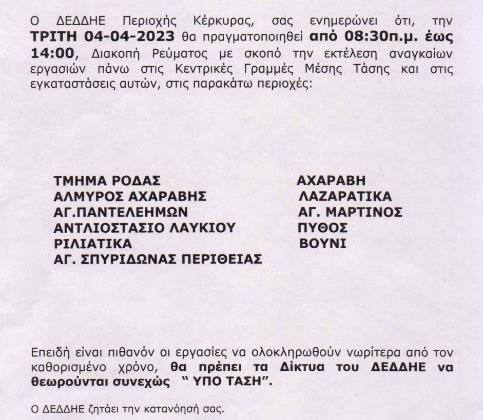 ΚΟΙΝΩΝΙΑΕΛΕΥΘΕΡΟΕΙΔΗΣΕΙΣ Έρχεται πολύωρη διακοπή ρεύματος στη βόρεια Κέρκυρα Αιτία της διακοπής που θα πραγματοποιηθεί την Τρίτη είναι οι εργασίες που θα πραγματοποιήσει ο ΔΕΔΔΗΕ. Last updated: 31/03/2023 10:53 CorfuPress.com Published: 31/03/2023 Share SHARE Αιτία της διακοπής που θα πραγματοποιηθεί την Τρίτη είναι οι εργασίες που θα πραγματοποιήσει ο ΔΕΔΔΗΕ. Διακοπή ρεύματος τη Δευτέρα-Δείτε που Που θα γίνει διακοπή ρεύματος την Τετάρτη Που θα γίνει διακοπή ρεύματος την Τετάρτη Επιστολή Επιμελητηρίου προς ΔΕΔΔΗΕ για τις πολύωρες διακοπές ρεύματος Που θα γίνουν προγραμματισμένες διακοπές ρεύματος το διάστημα 23-25 Αυγούστου Share This Article Facebook Whatsapp Whatsapp Email Copy Link Print Previous Article Συνελήφθη διωκόμενο πρόσωπο στον Ύψο Next Article Την Κυριακή, το τελευταίο αντίο στο Νίκο Μηλιώτη Δεν υπάρχουν Σχόλια Δεν υπάρχουν Σχόλια Αφήστε μια απάντηση Ακύρωση απάντησηςΗ ηλ. διεύθυνση σας δεν δημοσιεύεται. Τα υποχρεωτικά πεδία σημειώνονται με *Σχόλιο * Όνομα * Email * Ιστότοπος Αποθήκευσε το όνομά μου, email, και τον ιστότοπο μου σε αυτόν τον πλοηγό για την επόμενη φορά που θα σχολιάσω. ΑναζήτησηΑναζήτησηRecent PostsΌλα τα μάτια στον Θοδωρή, τον καπετάνιο μας! Τη Δευτέρα 22 Σεπτεμβρίου γιορτάζει… Σαν Σήμερα 22/9: Τα σημαντικότερα γεγονότα… Η πρόγνωση του καιρού Έφηβοι Ιονίου: Με περίπατο, συνεχίζουν στο Rising Stars! Recent CommentsΧωρίς σχόλια για εμφάνιση.