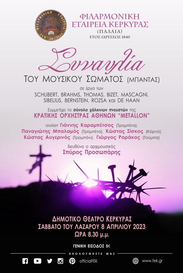 Στις 8 Απριλίου 2023, Σάββατο του Λαζάρου, η μπάντα της Φιλαρμονικής Εταιρείας Κερκύρας για ακόμη μια χρονιά σηματοδοτεί την έναρξη της κερκυραϊκής πασχαλινής περιόδου με την από ετών καθιερωμένη συναυλία της.